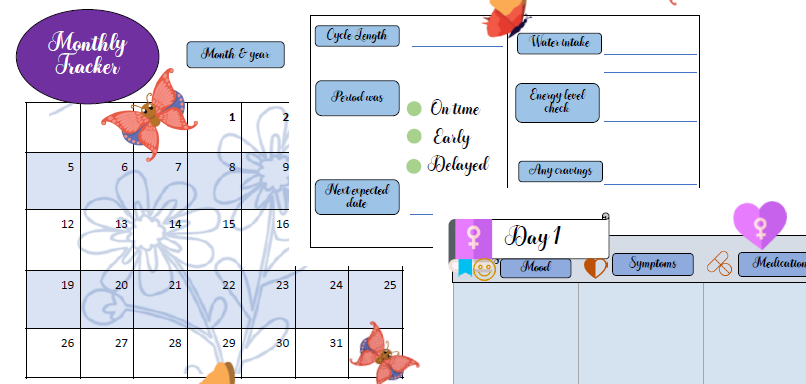 Colorful Printable period tracker journal pages for women.
